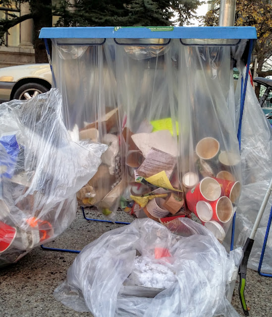 A chilly hour later, the crowd - now less than half the size - returned. Speeches and music continued while we six sorted and amalgamated bags of waste. The biggest collection: coffee cups, by far; followed by organic waste from lunches and snacks; then paper waste - bus tickets, cigarette packages, leaflets, newspapers and free magazines: The Georgia Straight, 24 hrs, Metro. Warning inserts from many, many cigarette packs. There was one bag of landfill-destined debris containing straws, candy wrappers, paper too dirty to recycle, an acrylic toque. I was amazed when I saw it all gathered up: just how much paper and plastic was discarded in the course of less than three hours!